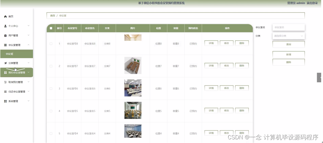 管理员点击会议室管理;在会议室管理页面输入会议室号、会议室名、分类、图片、位置、容量、预约状态等信息,进行查询,新增或删除会议室等操作;如图5-4所示。