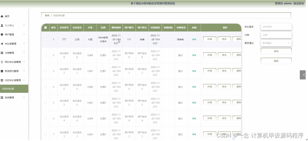 管理员点击归还会议室管理;在归还会议室管理页面输入会议室号、会议室名、分类、位置、预约时间、用户账号、用户姓名、归还时间、审核回复、审核状态、审核等信息,进行查询或删除归还会议室等操作;如图5-7所示。