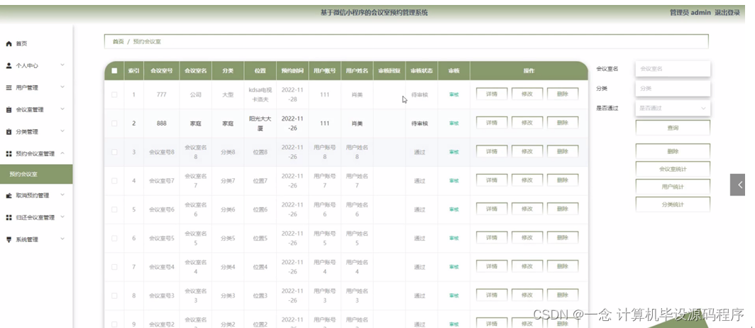 管理员点击预约会议室管理;在预约会议室管理页面输入会议室号、会议室名、分类、位置、预约时间、用户账号、用户姓名、审核回复、审核状态、审核等信息,进行查询或删除预约会议室等操作;如图5-5所示。