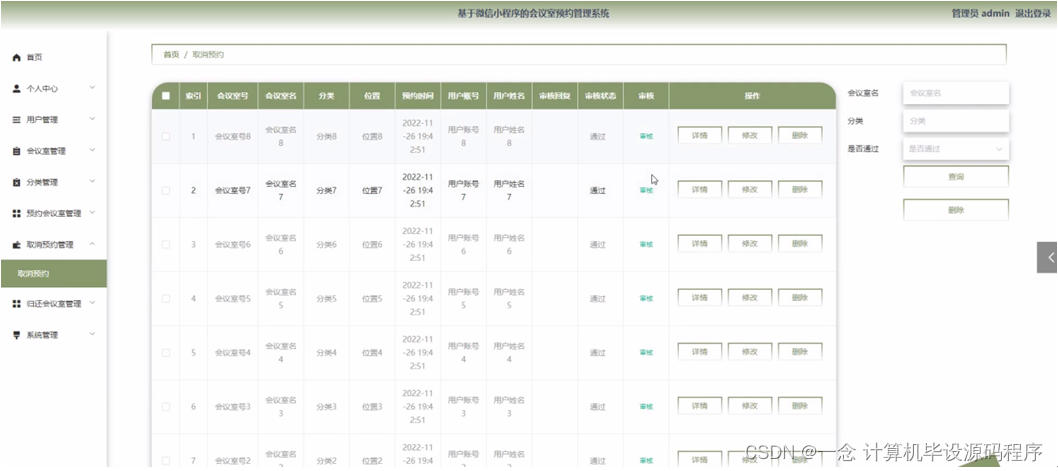 管理员点击取消预约管理;在取消预约管理页面输入会议室号、会议室名、分类、位置、预约时间、用户账号、用户姓名、审核回复、审核状态、审核等信息,进行查询或删除取消预约等操作;如图5-6所示。