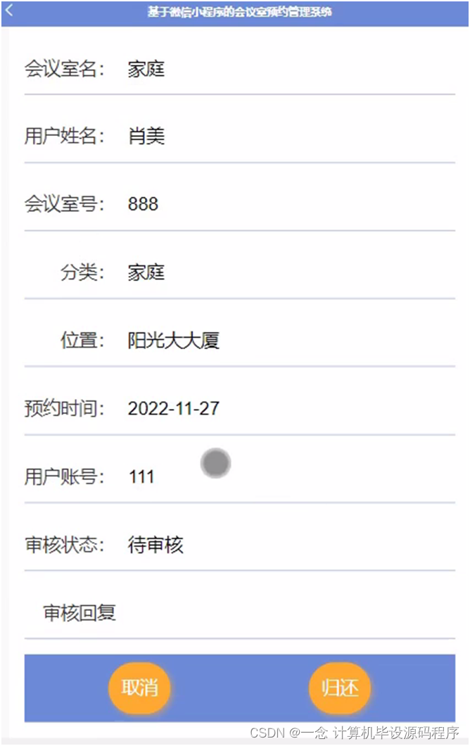 用户点击预约会议室,然后页面跳转到会议室号、会议室名、分类、位置、预约时间、用户账号、用户姓名、审核回复等详情,按照提示即可完成取消或者归还等操作。如图5-12所示。