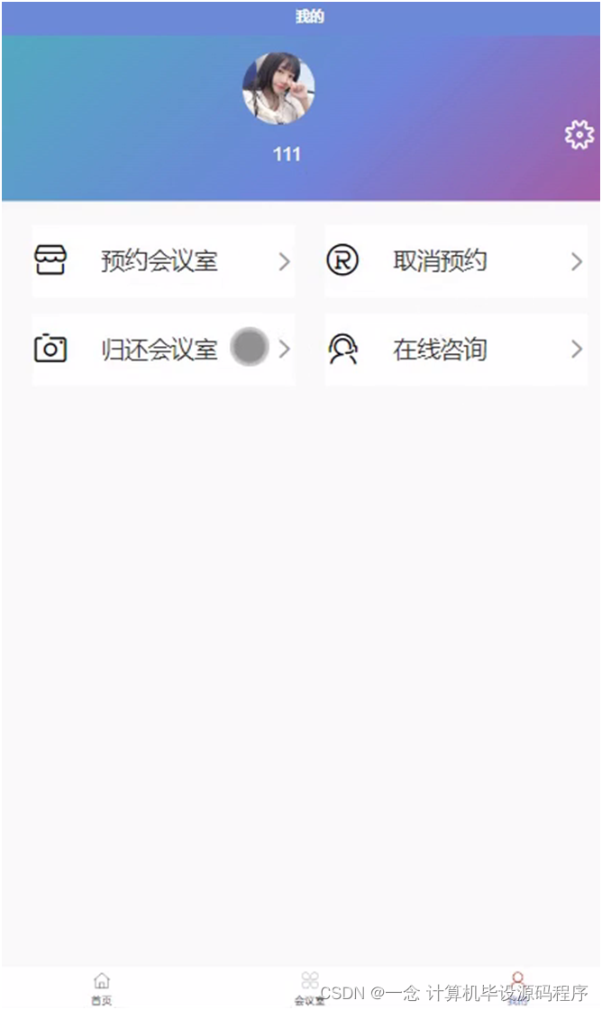 在我的功能界面,用户点击“我的”进入我的页面,在我的页面可以对预约会议室、取消预约、归还会议室、在线咨询等进行详细操作,如图5-13所示。