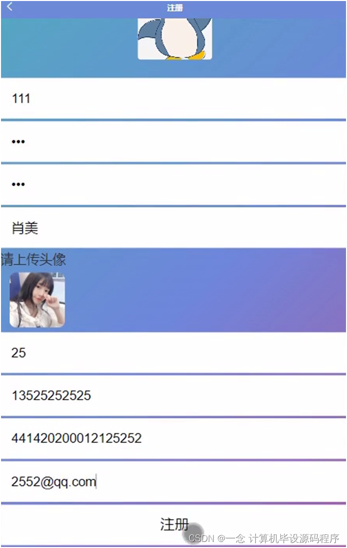 注册界面,第一次使用本小程序的使用者,首先是要进行注册,点击“注册”,然后就会进入到注册的页面里面,将用户信息录入注册表,确认信息正确后,页面才会跳转到登录界面,用户登录成功后可使用本小程序所提供的所有功能,如图5-8所示。