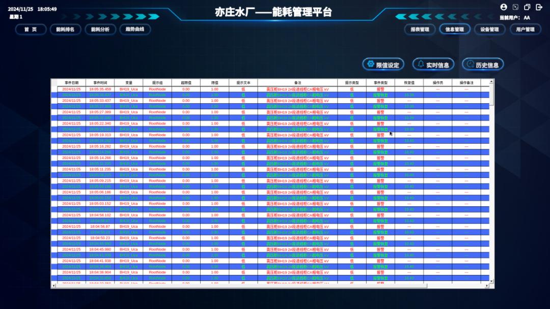 信息管理模块分为实时和历史报警两部分。实时报警窗展示当前报警信息,不同类型用不同颜色区分,方便操作人员及时发现问题。历史报警窗展示过往报警信息,支持筛选查询,便于追溯和分析。报警限值修改和自定义报警模块可灵活设置报警规则,满足用户不同需求。