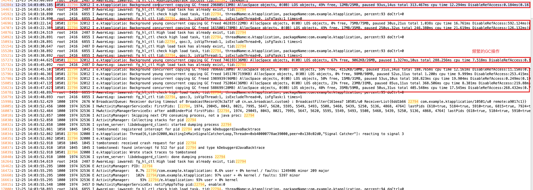 12-25 14:03:55.295 1000 1974 32536 E ActivityManager: 102% 22794/com.example.ktapplication: 97% user + 4% kernel / faults: 5397 minor