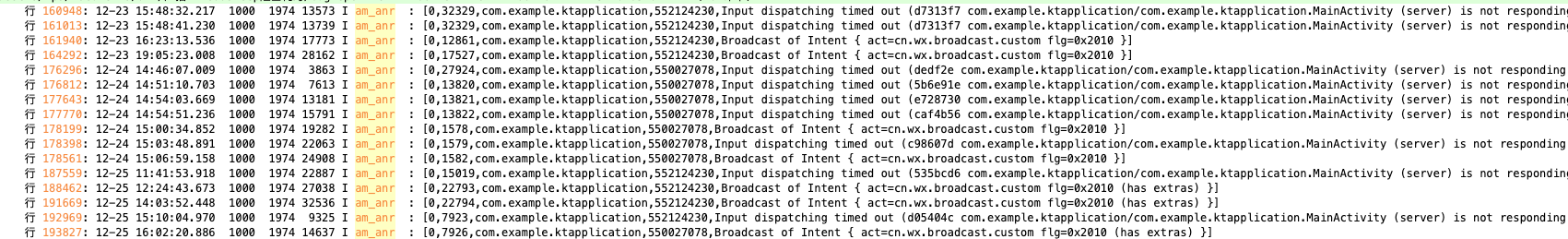 193827: 12-25 16:02:20.886 1000 1974 14637 I am_anr : [0,7926,com.example.ktapplication,550027078,Broadcast of Intent { act=cn.wx.broadcast.custom flg=0x2010 (has extras) }]