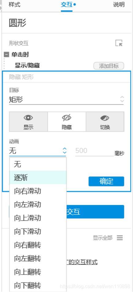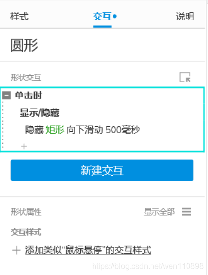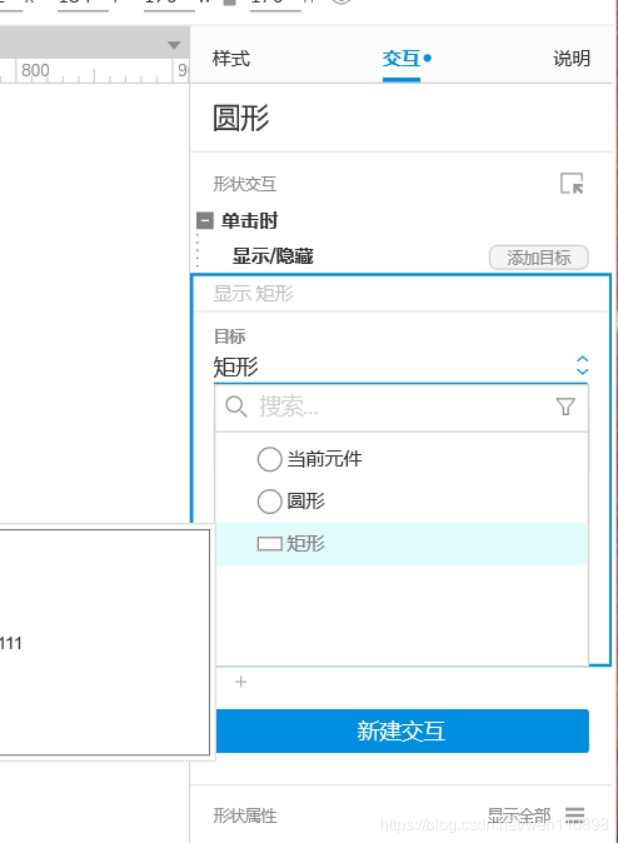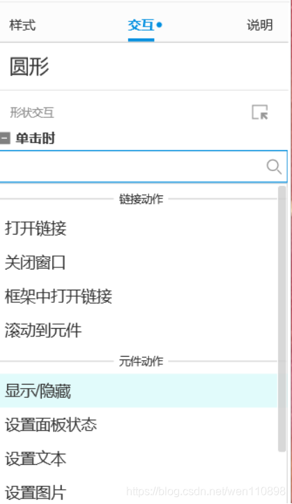 1、选中圆形添加交互事件,选择显示/隐藏。