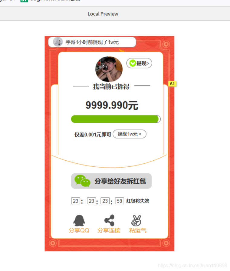 提现按钮添加了交互中的连接,可以跳转你需要的页面,下面的分享QQ、连接、粘运气同。