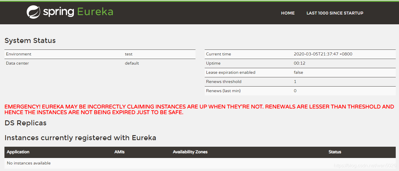启动服务成功后,用浏览器打开http://localhost:8888/,展示如下网页则说明Eureka注册中心启动成功。