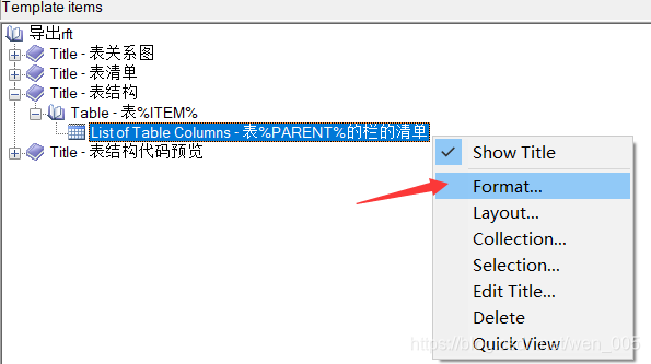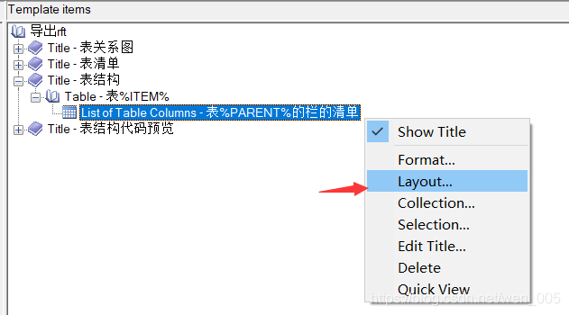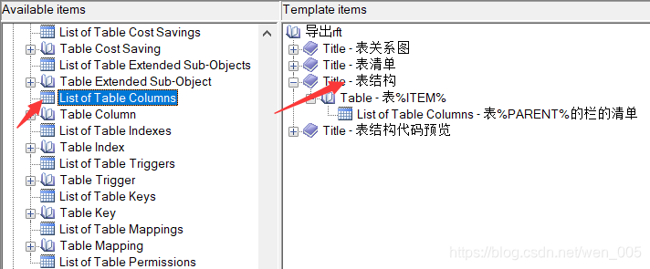 在模板左侧找到“Table——>List of Table Columns”,然后拖动到右边的表结构中。