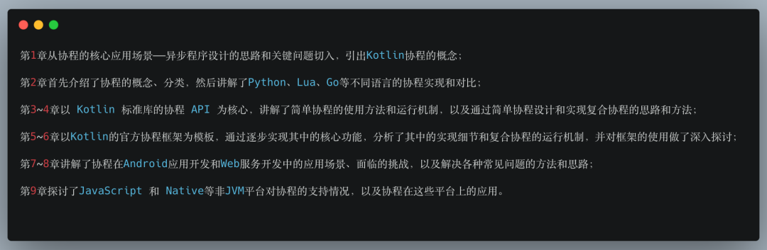 除了介绍 API 的基本使用,还提供了使用 Kotlin 协程设计实现各类复合协程 API 的思路和方法,并抽象出一套系统的设计思路,通过 CoroutineLite 这个项目的设计实现,帮助大家深入了解官方协程框架的内部运行机制。