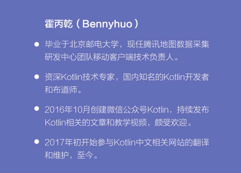 这本书适用于有一定基础的 Kotlin 开发者,包括但不限于正在使用和希望使用 Kotlin 开发 Android、Web 服务、iOS、前端等应用的开发者。