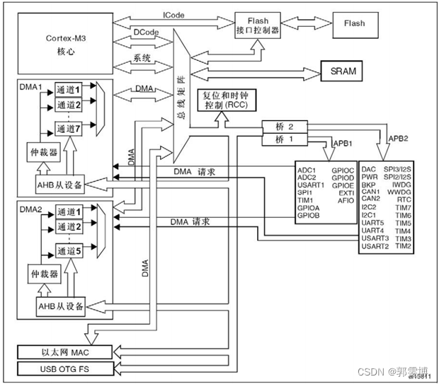 ⑦ 闪存、SRAM、外设的SRAM、APB1 APB2和AHB外设均可作为访问的源和目标。