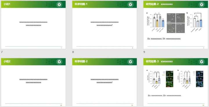 7.研究结论页:总结本研究的总体结论,展示一张总结的模式图,并写出2-3点创新性发现; 8.研究不足之处页:自己预先指出研究的不足之处,让评委知道你已经意识到这些问题; 9.已取得研究成果页:展示已发表文章及申请专利情况;