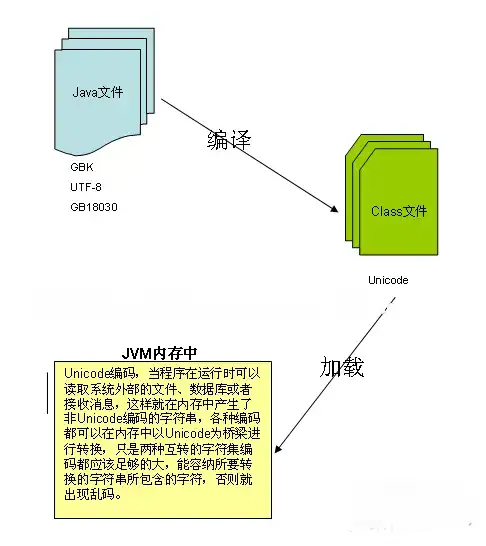 这里Java文件的编码可能有多种多样,但Java编译器会自动将这些编码按照Java文件的编码格式正确读取后产生class文件,这里的class文件编码是Unicode编码(具体说是UTF-16编码)。