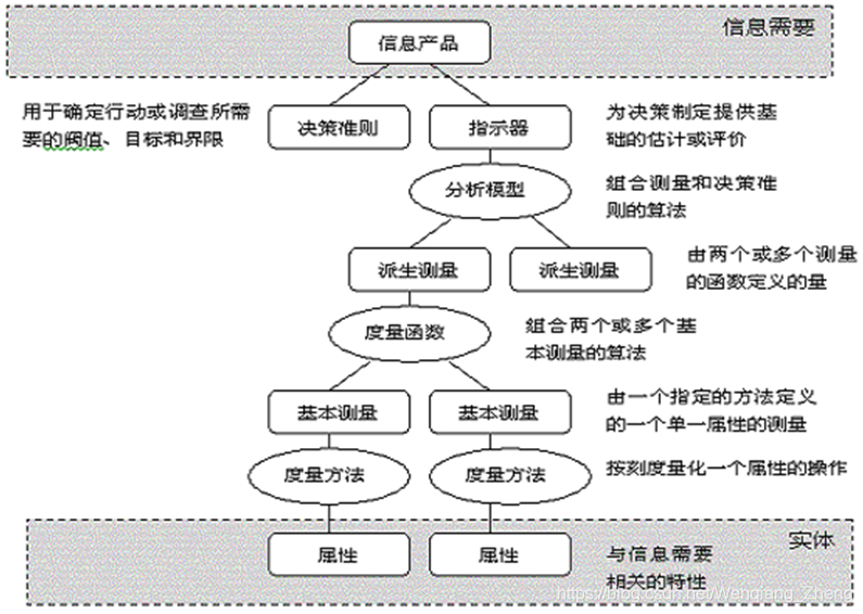 在测试实践中,测试人员应该将重点转移到这些术语背后对应的内容和活动上,理解其后面的东西,术语本身就可以自然得到澄清。关于度量相关的其他一些概念,可以参考标准ISO 15939-2007度量信息模型,其结构框架如下所示: