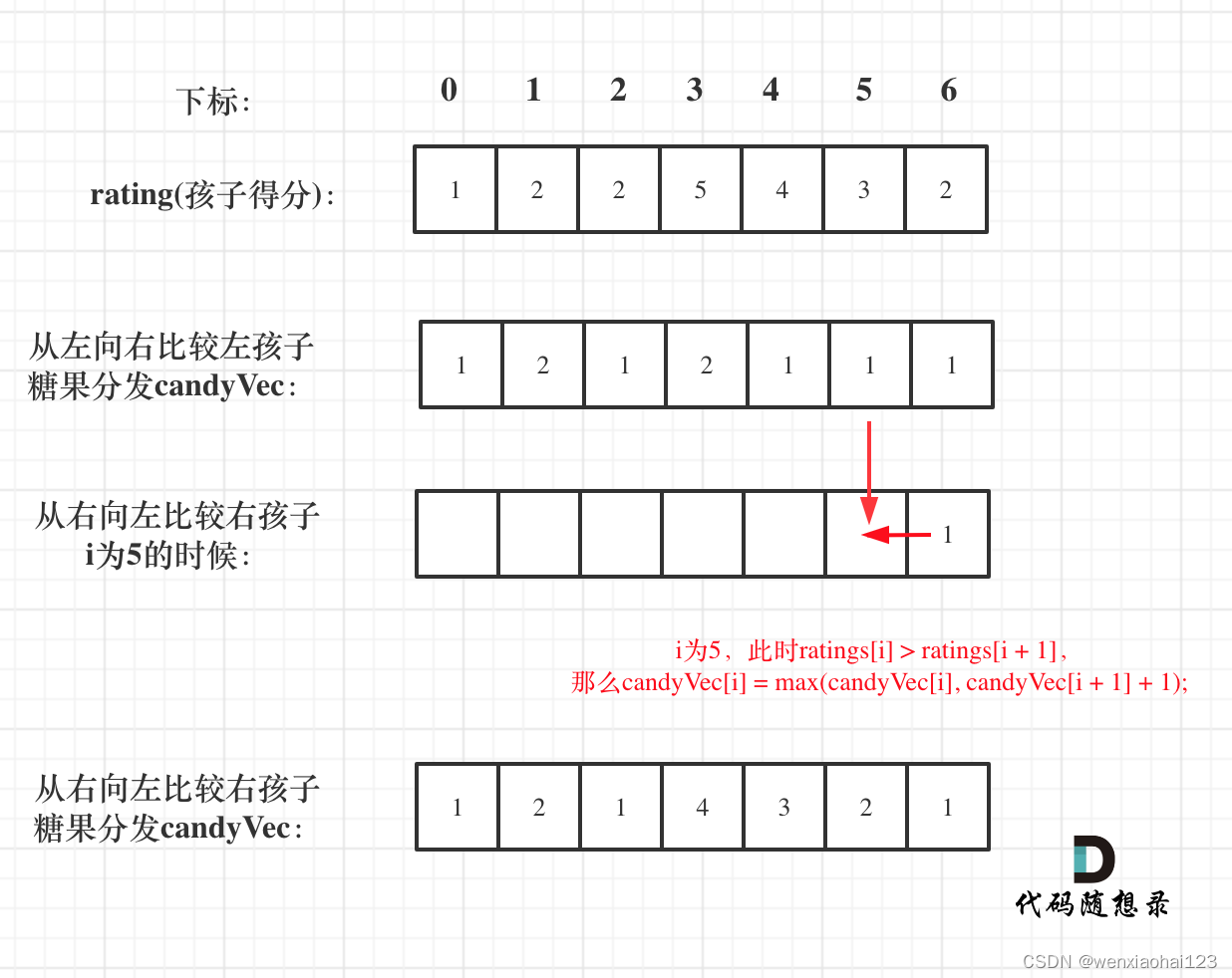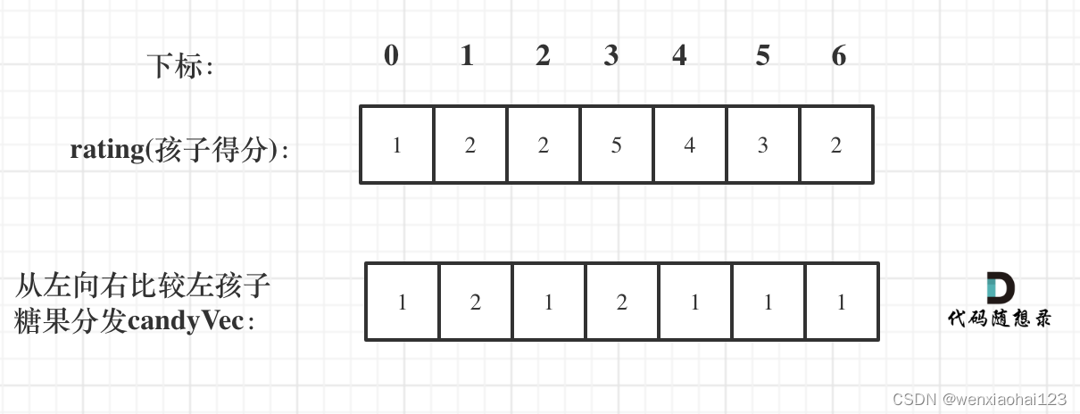 这样的思路确保了每个孩子都至少分配到了一个糖果,并且满足了相邻孩子中评分更高的孩子获得更多糖果的要求,从而得到了正确的答案。