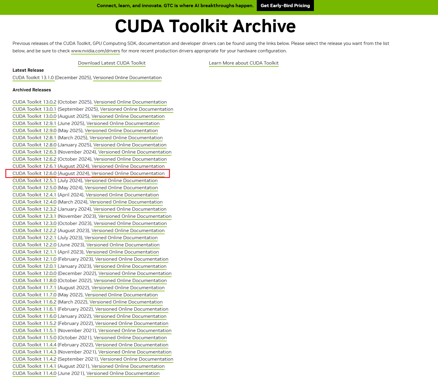 除了根据算力,我们得到的版本范围之外,还要根据驱动和自己需求进一步筛选(我的驱动版本是575.88,最高允许安装的cuda版本是12.9)