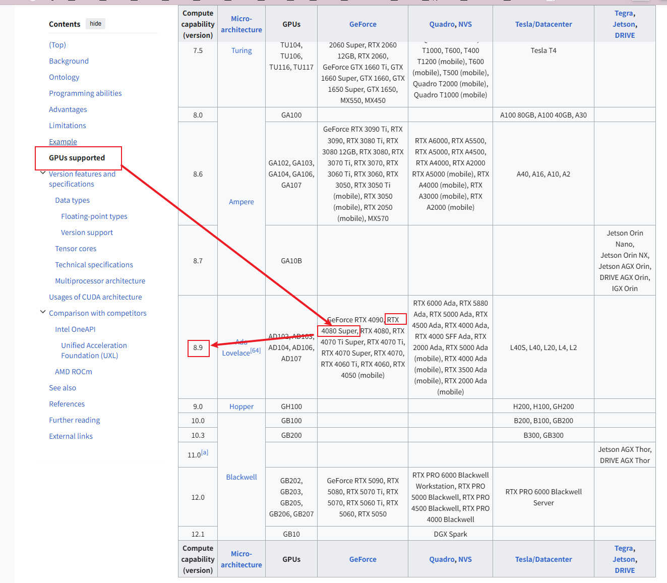 进入cuda官网,往下滑,找到自己显卡对应算力(我的是8.9)