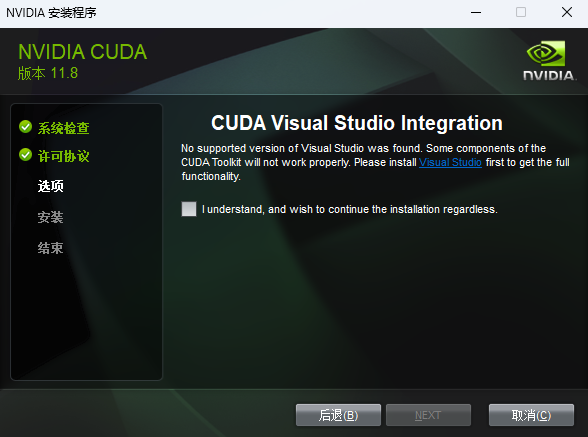 一直下一步如果出现下面的页面,表示没有VisualStudio,可以先去安装这个东西,也可以跟我一样,回退到上一个界面,取消这个选项