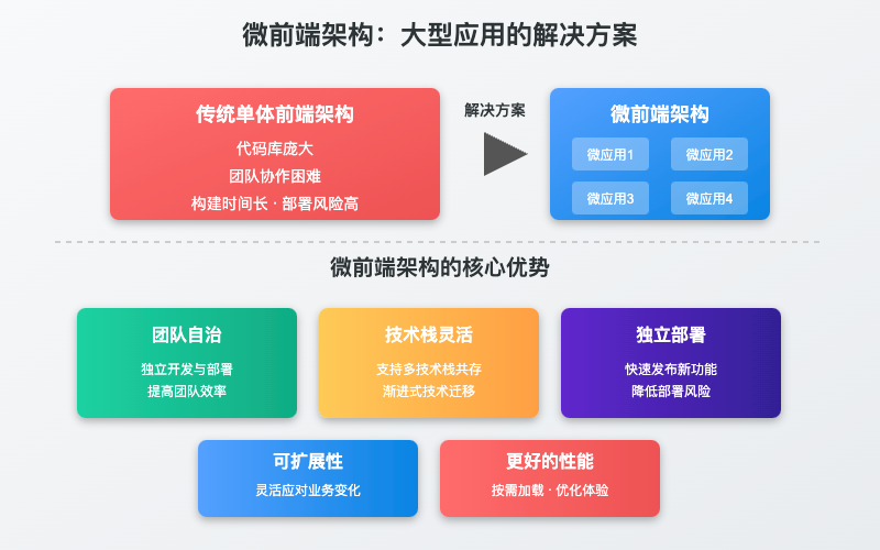 在大型项目中,多个团队同时开发一个前端应用往往会导致代码冲突、沟通成本高等问题。微前端架构允许每个团队负责自己的微前端应用,自主决定技术栈和开发流程,大大提高了团队的自治性和开发效率。