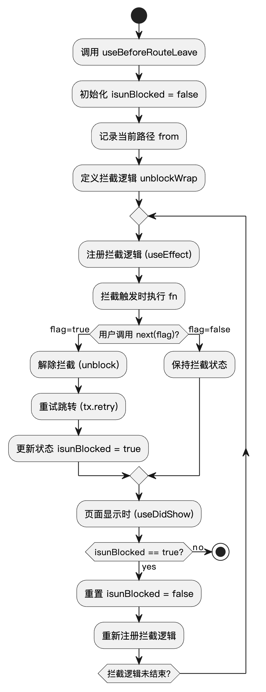 自定义 React 钩子,用于在 Taro 应用中拦截路由跳转,并在跳转前执行自定义逻辑(例如提示用户挽留)