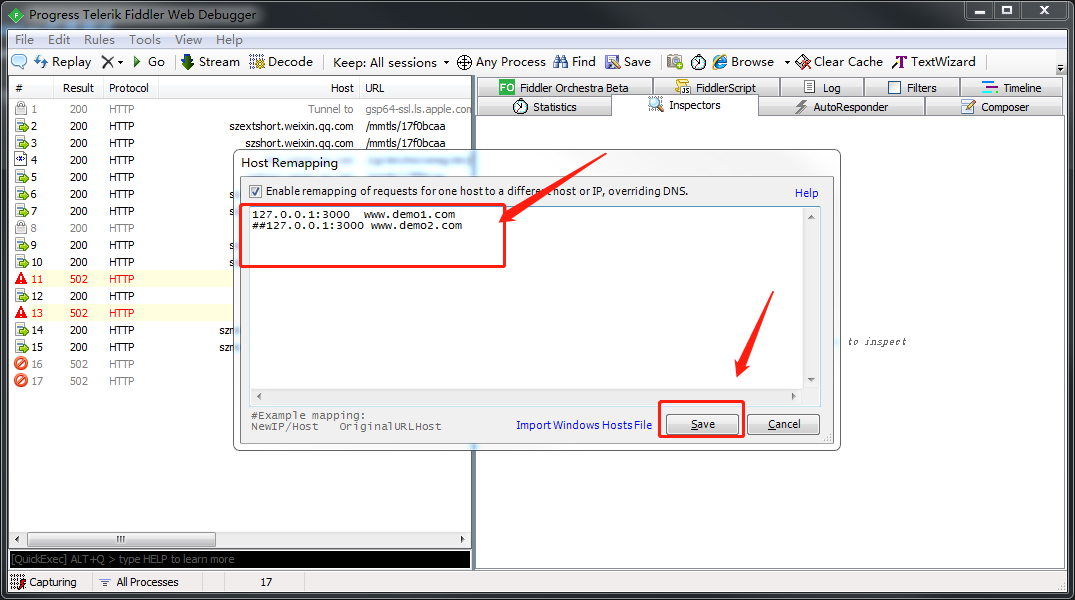 代理不仅可以本地调试,假如你的代码已经发布到测试环境,域名为www.demo2.com 那么你可以通过配置fiddler的hosts,即可利用测试环境来调试本地代码。