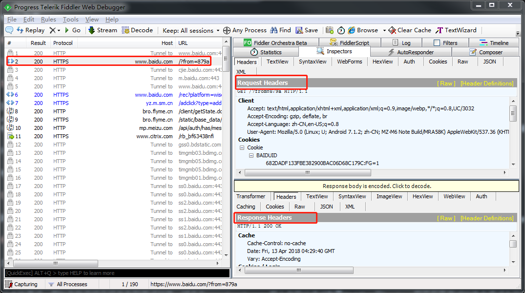 完成了以上步骤即可通过fiddler代理手机访问的地址了。手机访问的所有请求,也会被fiddler抓包,假如我在手机访问百度,抓包如图(可以查看请求头,和返回头等信息等等)