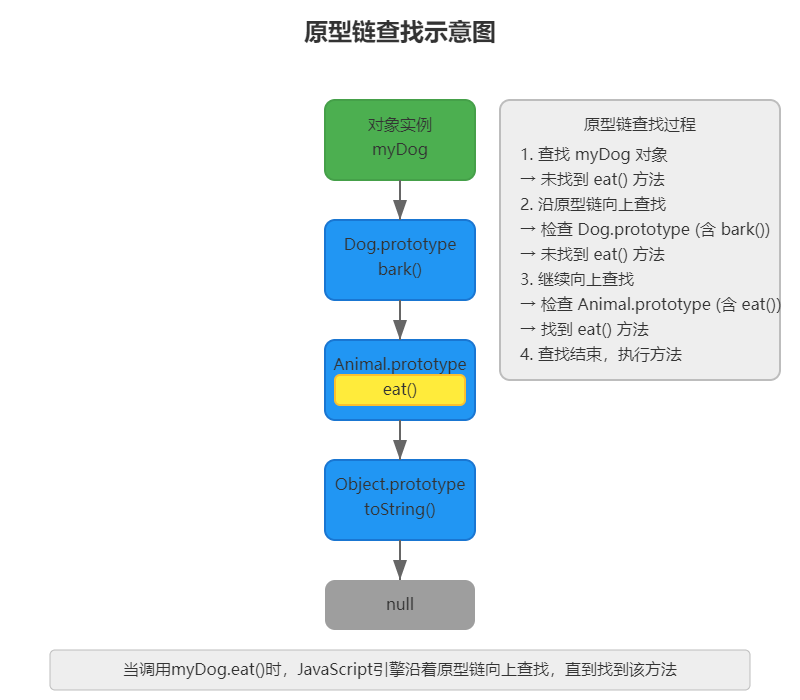 在这个例子中,myDog对象的原型链是:myDog -> Dog.prototype -> Animal.prototype -> Object.prototype -> null。当我们调用myDog.eat()时,JavaScript首先检查myDog对象本身是否有eat方法,没有找到就沿着原型链向上查找,最终在Animal.prototype上找到了这个方法。