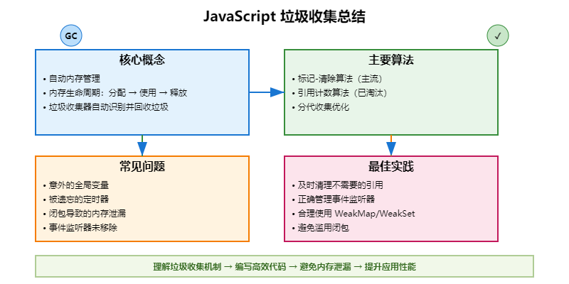 JavaScript 的垃圾收集机制为我们提供了自动内存管理的能力,但这并不意味着我们可以忽视内存管理。理解垃圾收集的工作原理、常见算法以及内存泄漏的原因,对于编写高性能的前端应用至关重要。