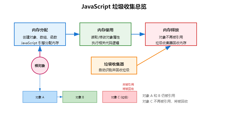 JavaScript 引擎内置了垃圾收集器(Garbage Collector),它会自动识别并释放不再使用的内存。虽然开发者不需要手动管理内存,但理解垃圾收集的工作原理能帮助我们编写更高效的代码,避免常见的内存泄漏问题。