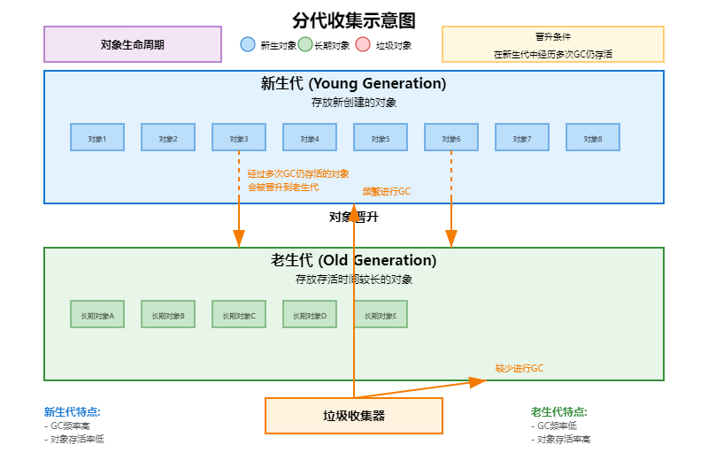 这种分代策略基于"大多数对象在创建后很快就会死亡"的观察。新生代的垃圾收集频率较高,而老生代的收集频率较低。