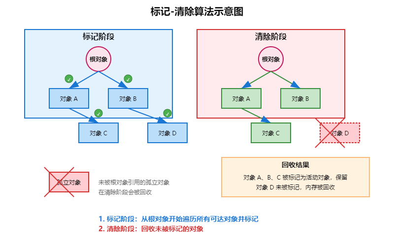 - 清除阶段:遍历整个堆内存,回收未被标记的对象