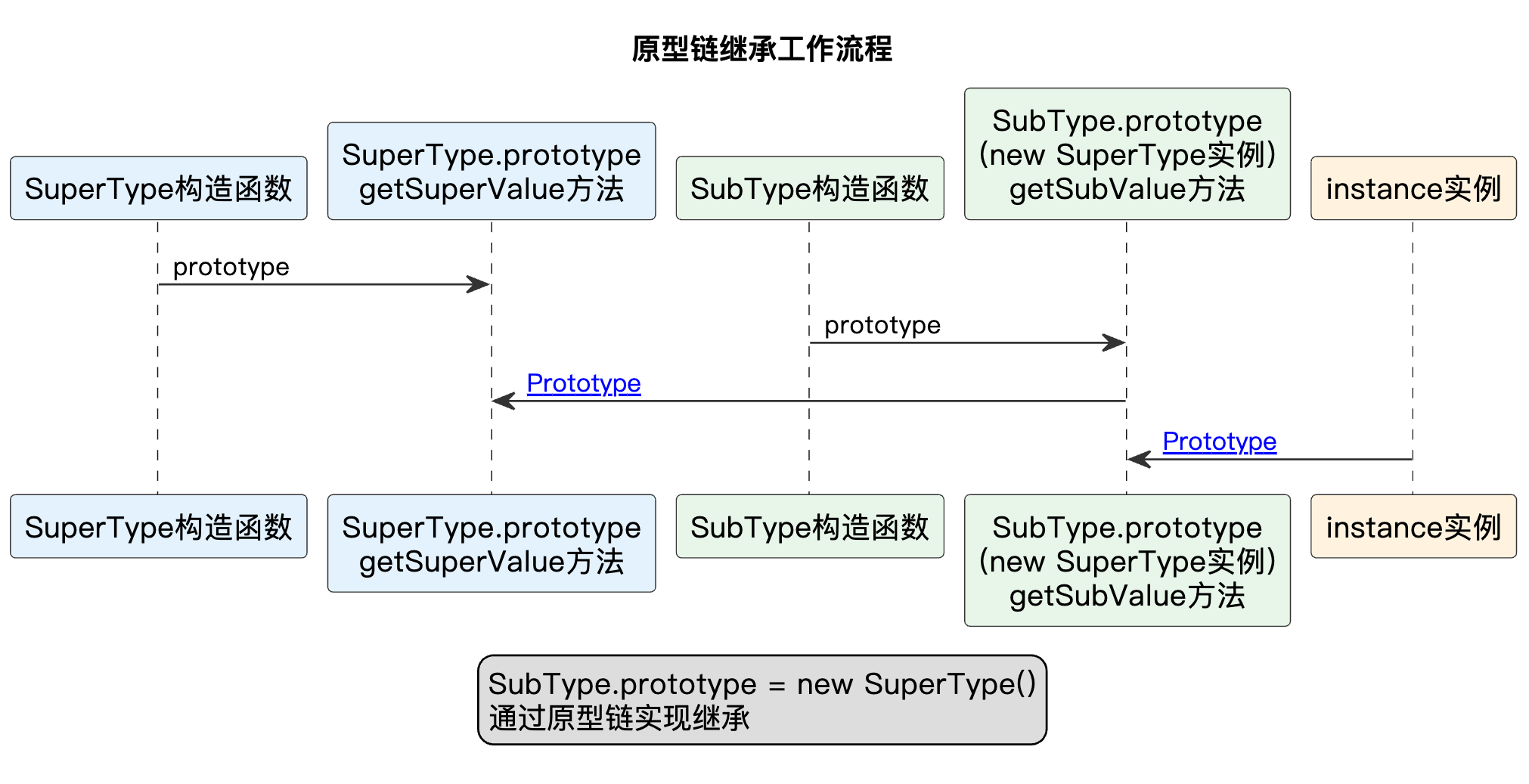 原型链继承的核心思想是让一个构造函数的原型对象等于另一个类型的实例。这样,子类型就可以访问到超类型的所有属性和方法。