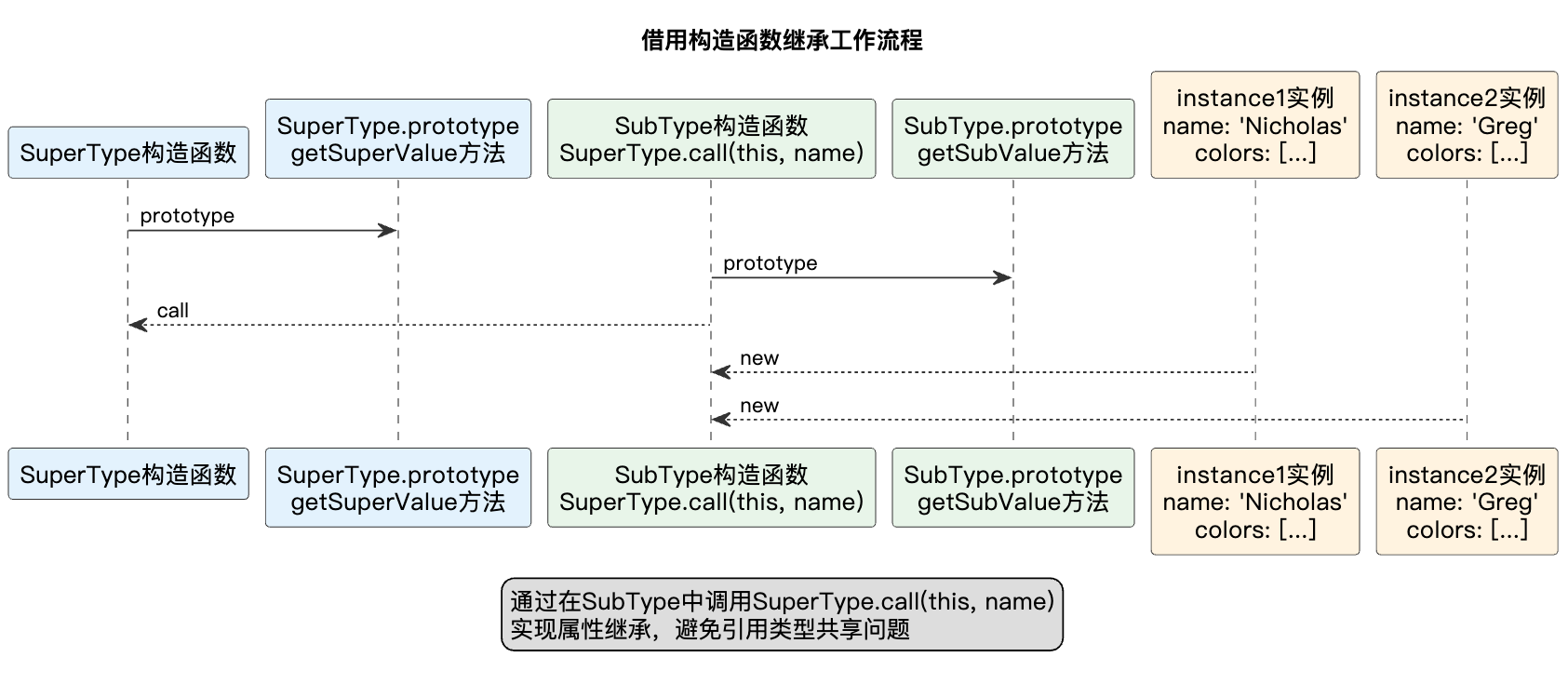 借用构造函数继承也被称为伪造对象或经典继承,它通过在子类型构造函数的内部调用超类型构造函数来实现继承。