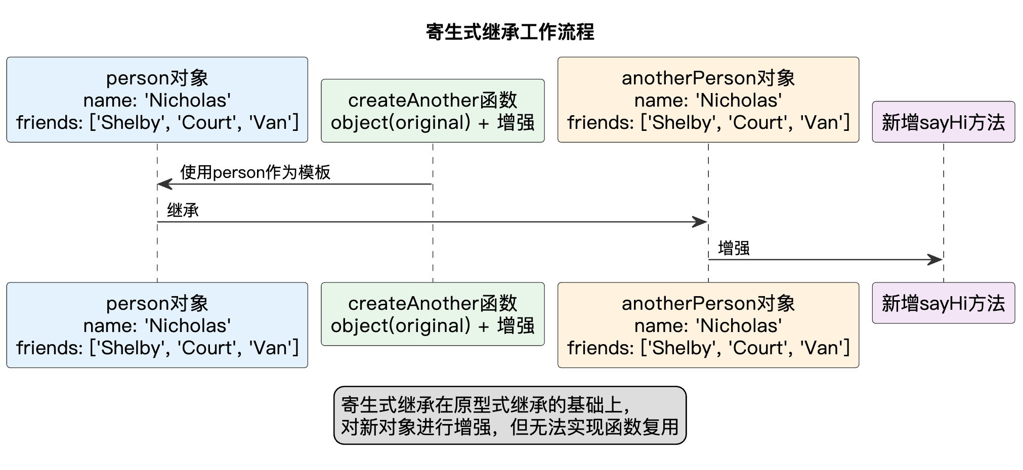 - 寄生式继承:适用于在不影响原始对象的情况下,为新对象添加方法
