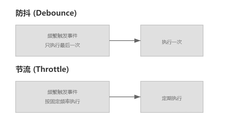| 执行时机 | 在事件停止触发一段时间后执行 | 在指定的时间间隔内最多执行一次 |