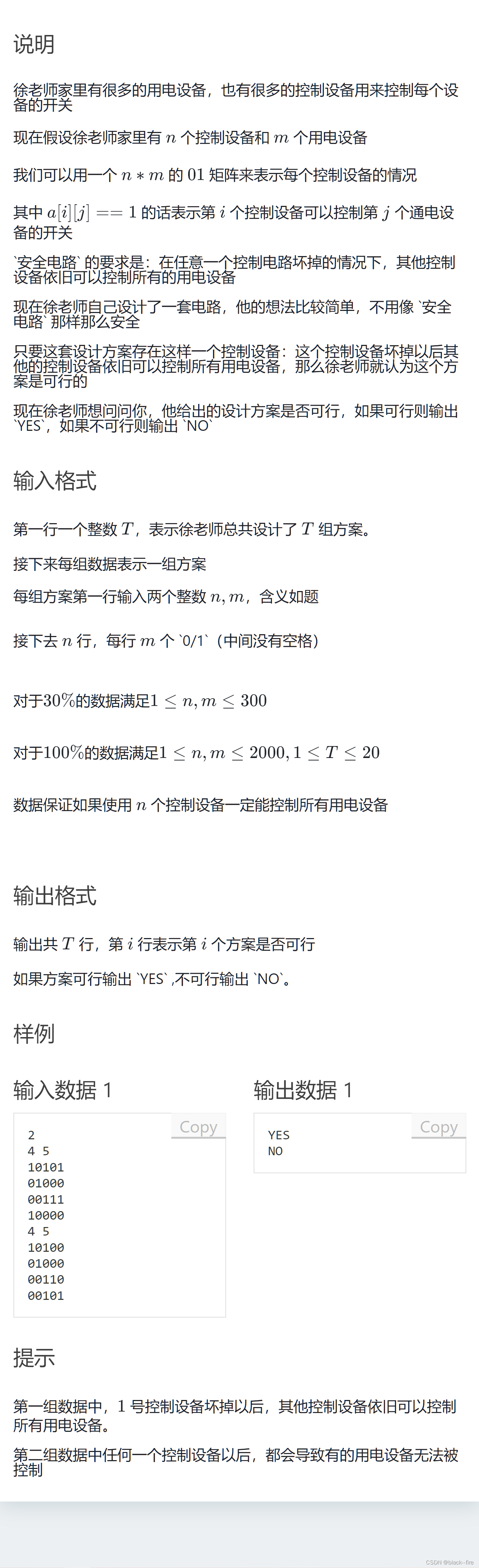 枚举开关,将这个控制设备的贡献减掉,如果仍然能控制所有用电设备则输出YES,最后如果都没输出YES,最后就输出NO