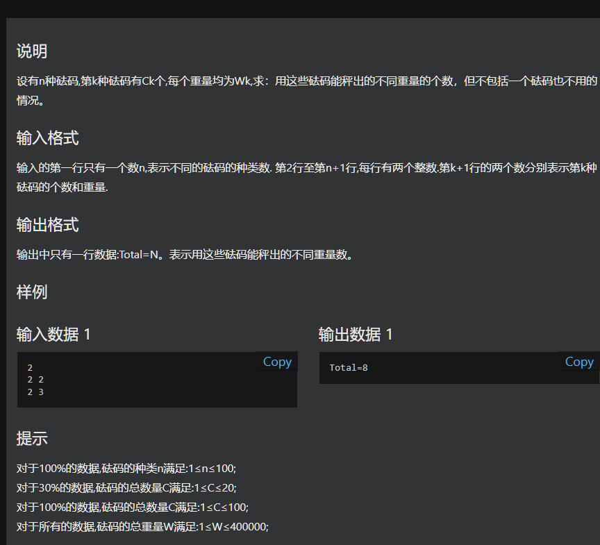 dp[i][j] 表示前 i 种砝码能否组合出重量 j