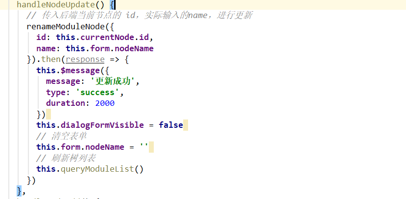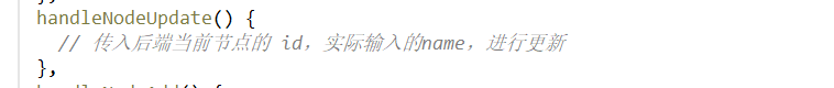 接下来编辑页面点击【保存按钮】的时候,调用的是 handleNodeUpdate 方法,通常需要传当前节点的 id 用于后端查询数据;传入输入的 name,用于节点名称的更新。