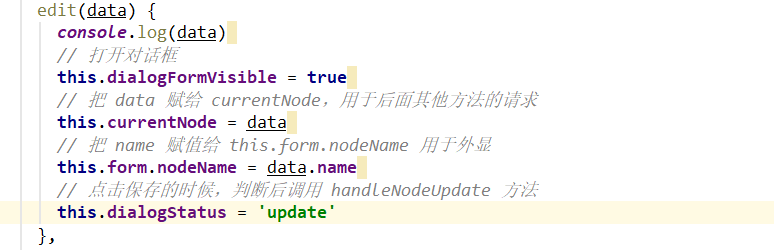本来树形控件里没有自带的编辑操作,我直接加了一个按钮在上面,绑定点击事件调用edit(data)方法。
