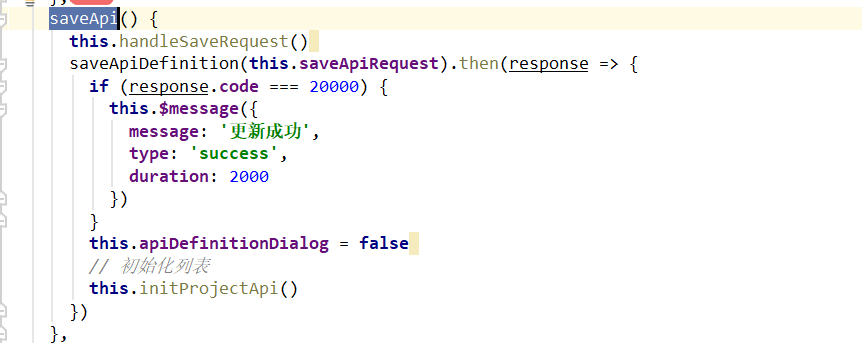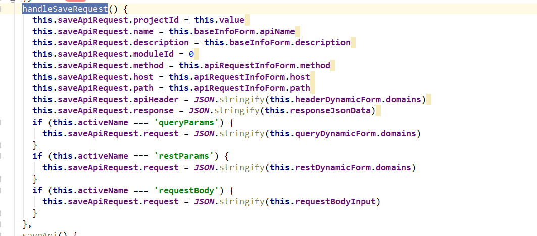 注意,在方法里有个判断。就是在这 3 个 tabs 中,我点击的哪一个,就会把其中添加的内容赋值给this.saveApiRequest.request: