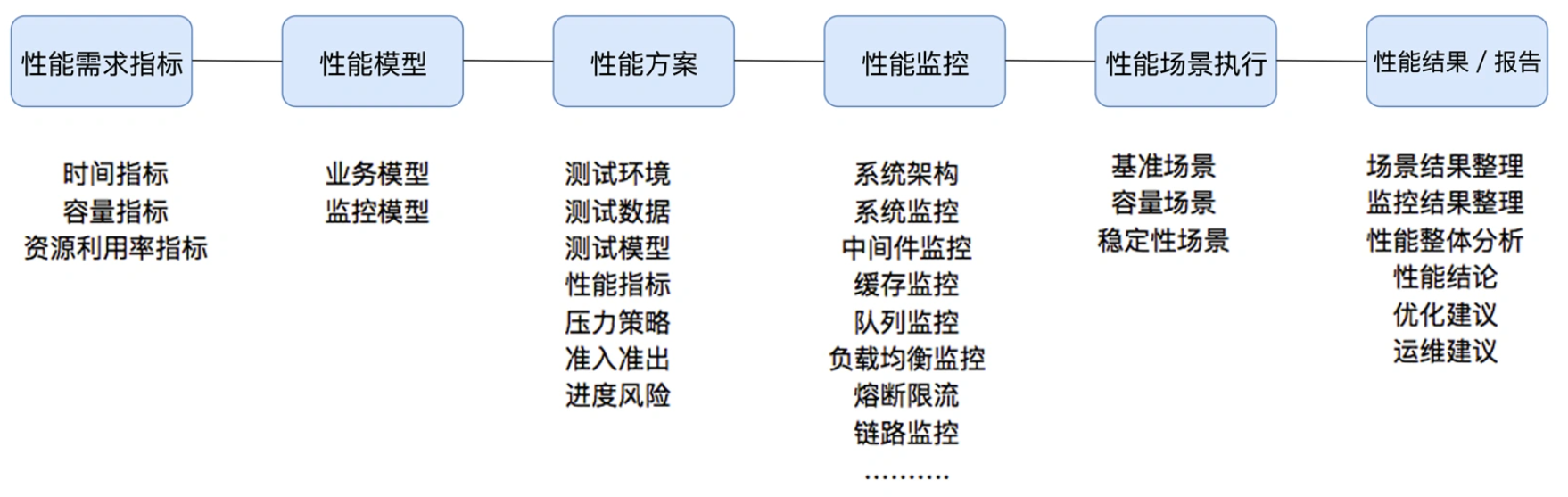 性能测试针对系统的性能指标,建立性能测试模型,制定性能测试方案,制定监控策略,在场景条件之下执行性能场景,分析判断性能瓶颈并调优,最终得出性能结果来评估系统的性能指标是否满足既定值。