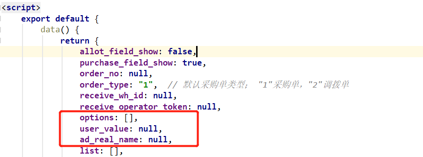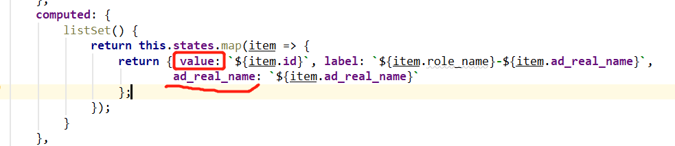 这个options是个列表,里面的元素是一个个对象{},对象里就是key-value。之前只放了{value:"", label: ""},现在我要把ad_real_name也放进去,变成{value:"", label: "", ad_real_name: ""}。
