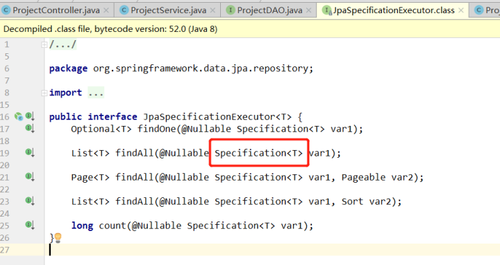 在dao层里需要做个修改,让ProjectDAO再多继承一个类:JpaSpecificationExecutor。