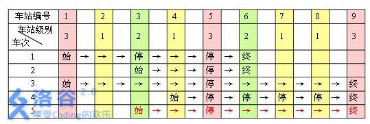 例如,下表是 5 趟车次的运行情况。其中,前 4 趟车次均满足要求,而第 5 趟车次由于停靠了 3 号火车站(2 级)却未停靠途经的 6 号火车站(亦为 2 级)而不满足要求。