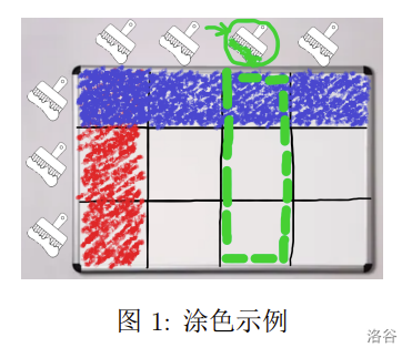 这个游戏的名字叫涂色游戏,视频中的游戏界面是一个 n 行 m 列的网格,初始时每一个格子都是白色(用数字 0 表示)。其中每一行的左侧、每一列的上方都有一把带颜色的刷子。玩家点击某个刷子后,这个刷子会将其右侧(或下方)的一整行(或一整列)涂上同一种颜色,该行(或该列)格子原有的颜色都会被覆盖成新涂上的颜色。