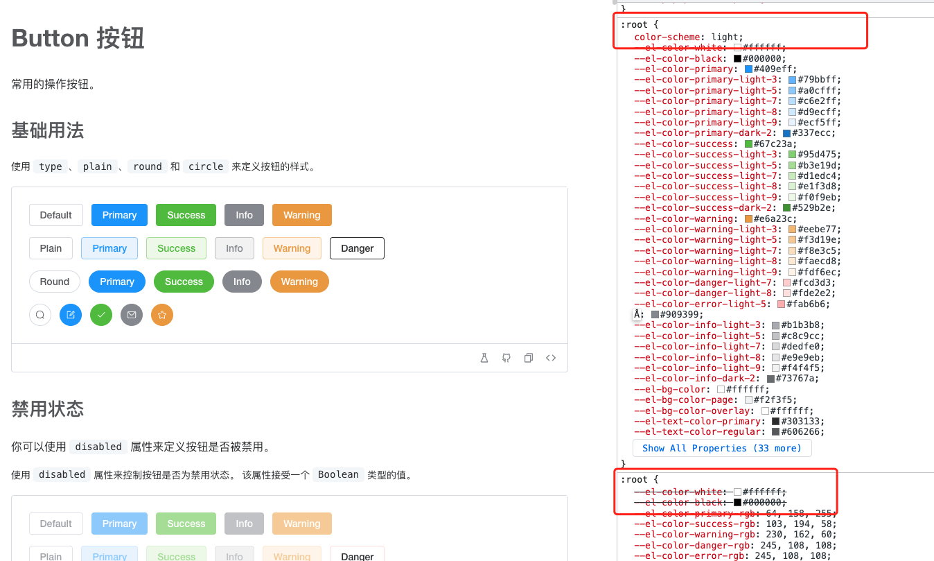 button.scss 会在前面执行下面这段代码生成 组件局部 css 自定义变量