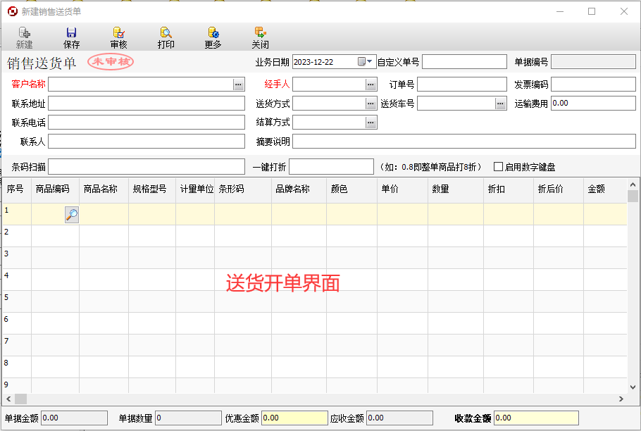 - 送货单据编辑:可录入送货客户、送货方式、结算方式、运费、商品明细,能批量多选商品信息,选择客户历史价格等。支持自定义设计客户销售单格式,进行套打设计,可打印 A4、二等份、三等份单据。