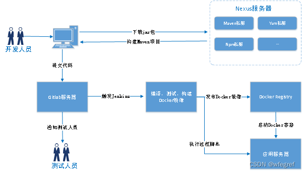 开发人员在搭建开发环境时,可选择从本地Nexus服务器下载jar包,并使用Maven构建项目,版本控制工具使用Gitlab管理,开发人员开发完一个功能后,提交代码至Gitlab,此时测试人员收到通知,对开发人员提交的代码进行测试,测试完成后,自动触发Jekins进行代码的自动编译、测试,并构建Docker镜像,将构建后的Docker镜像下载至应用服务器,远程调用脚本,重启应用服务器。